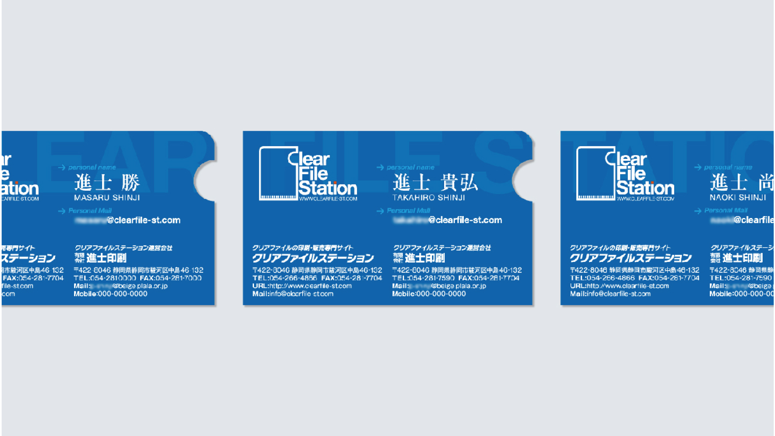 静岡市にある印刷会社 進士印刷様が運営する「クリアファイルステーション」のDM・名刺・ショップカード・サンプル用クリアファイルなどの各種アプリケーションツールの制作を担当させて頂きました。