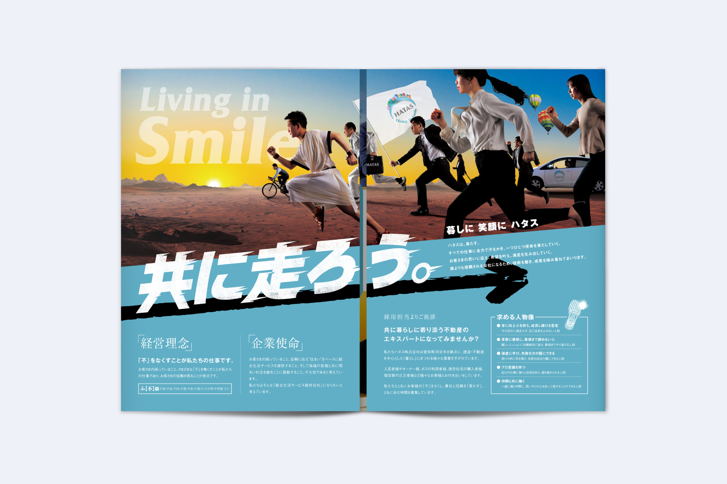 新卒採用者の会社への興味を高めるためビジュアルで好奇心を刺激する構成とするため同社の経営方針である「暮しに 笑顔に ハタス」という仕事への向き合い方と「走れメロス」の約束を果たす様子をリンクさせ「約束を果たす物語」としてビジュアルと内容を構成しました。
